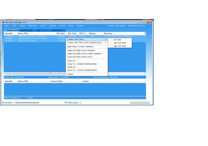 폴더를 만드는게 아니라 하드 형식을 wbfs로 해야 되요 저 프로그램으로 대상 외장하드를 wbfs형식으로 포맷을 하면 pc에서 정상적으로 인식은 못하지만 저 프로그램에서 wbfs 하드로 인식으로 하고 게임을 넣을때는 iso 파일만 불러오게 하면 지가 알아서 적당히 더미빼고 하드에 전송을 합니다